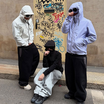 Vestuário Fabricante Custom Wholesale Streetwear Outdoor Windbreaker Capuz Impermeável Windproof Jacket com Óculos De Sol Lente